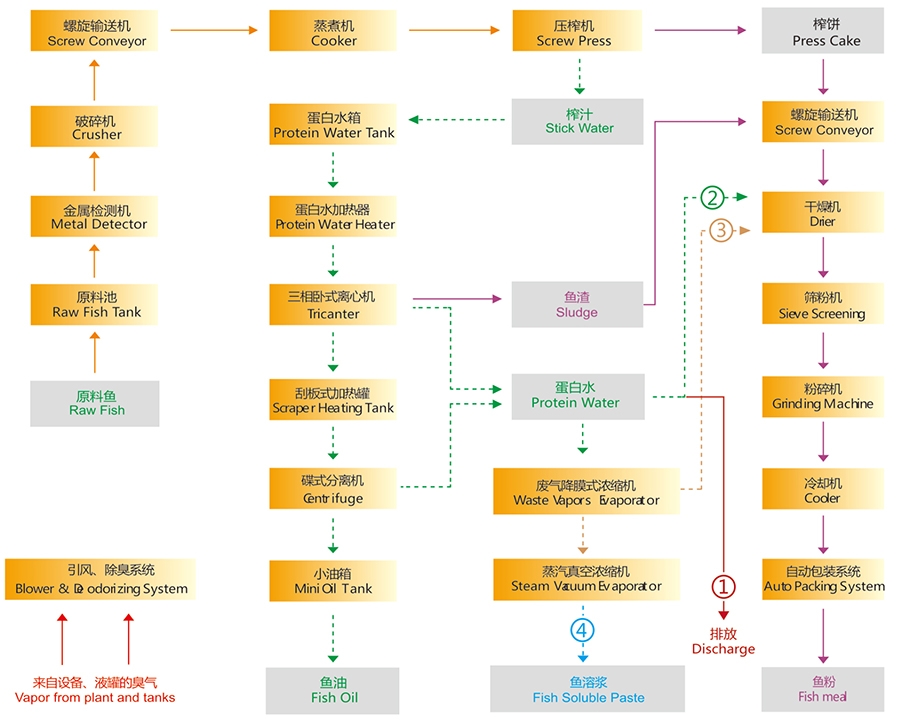 濕法魚粉魚油生產(chǎn)系統(tǒng)對榨汁進(jìn)行固雜、油水分離后,獲得蛋白水。根據(jù)對分離機出來的蛋白水所采取的不同加工工 藝,可以提供4種不同的魚粉生產(chǎn)線配套方案。