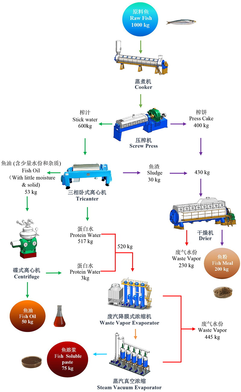 我們可以根據(jù)客戶(hù)的投資規(guī)模,工廠選址,環(huán)保要求等條件,為其選擇更好的工藝方案?,F(xiàn)以第4種生產(chǎn)線配套方案為例作簡(jiǎn)要介紹,同時(shí)結(jié)合相應(yīng)的工藝流程圖及物料平衡圖,供客戶(hù)參考。物料平衡圖中的數(shù)據(jù),尤其是魚(yú)油的得率,會(huì)因原料魚(yú)種類(lèi)及其捕獲季節(jié)的不同而有所變化。